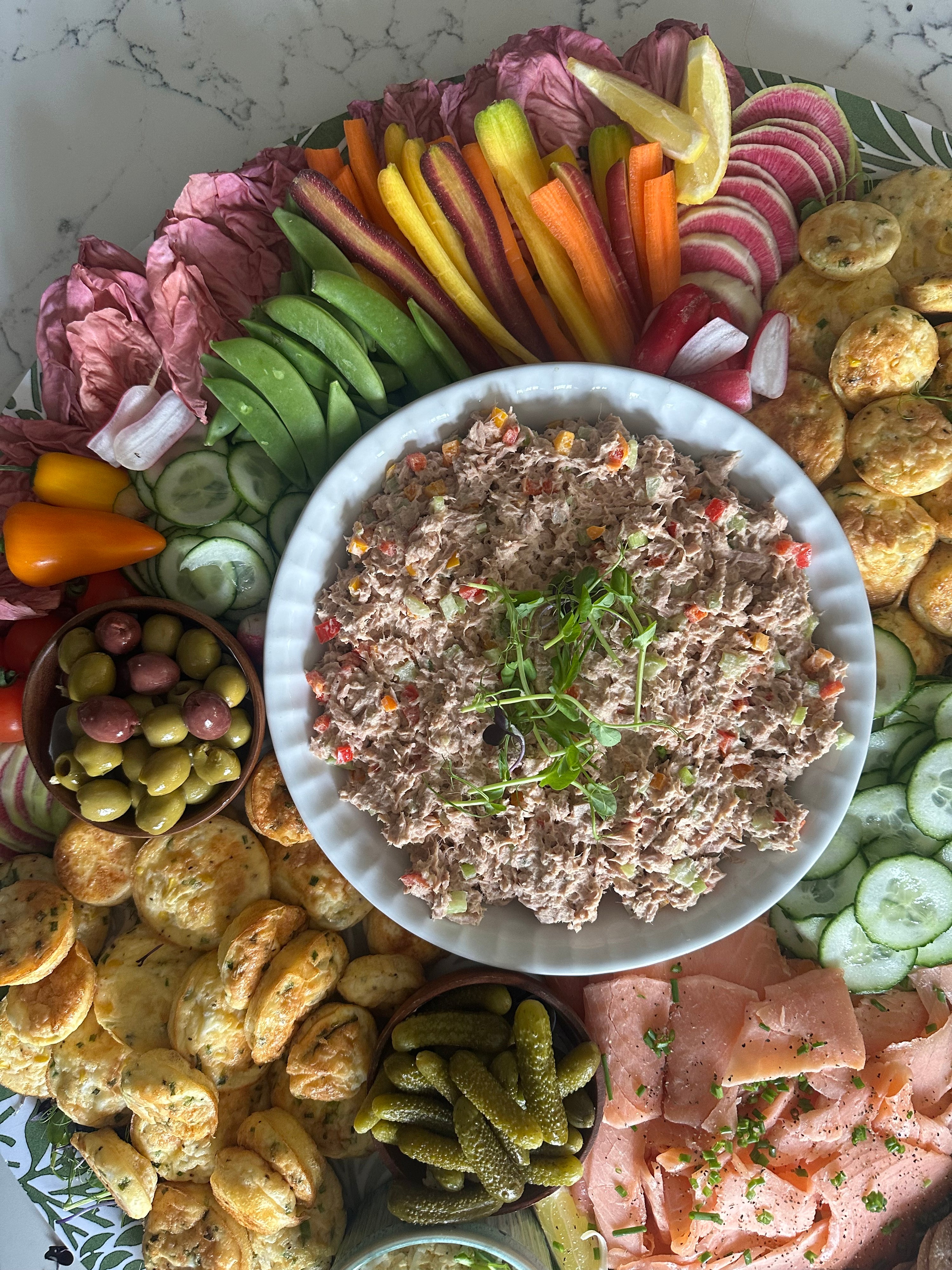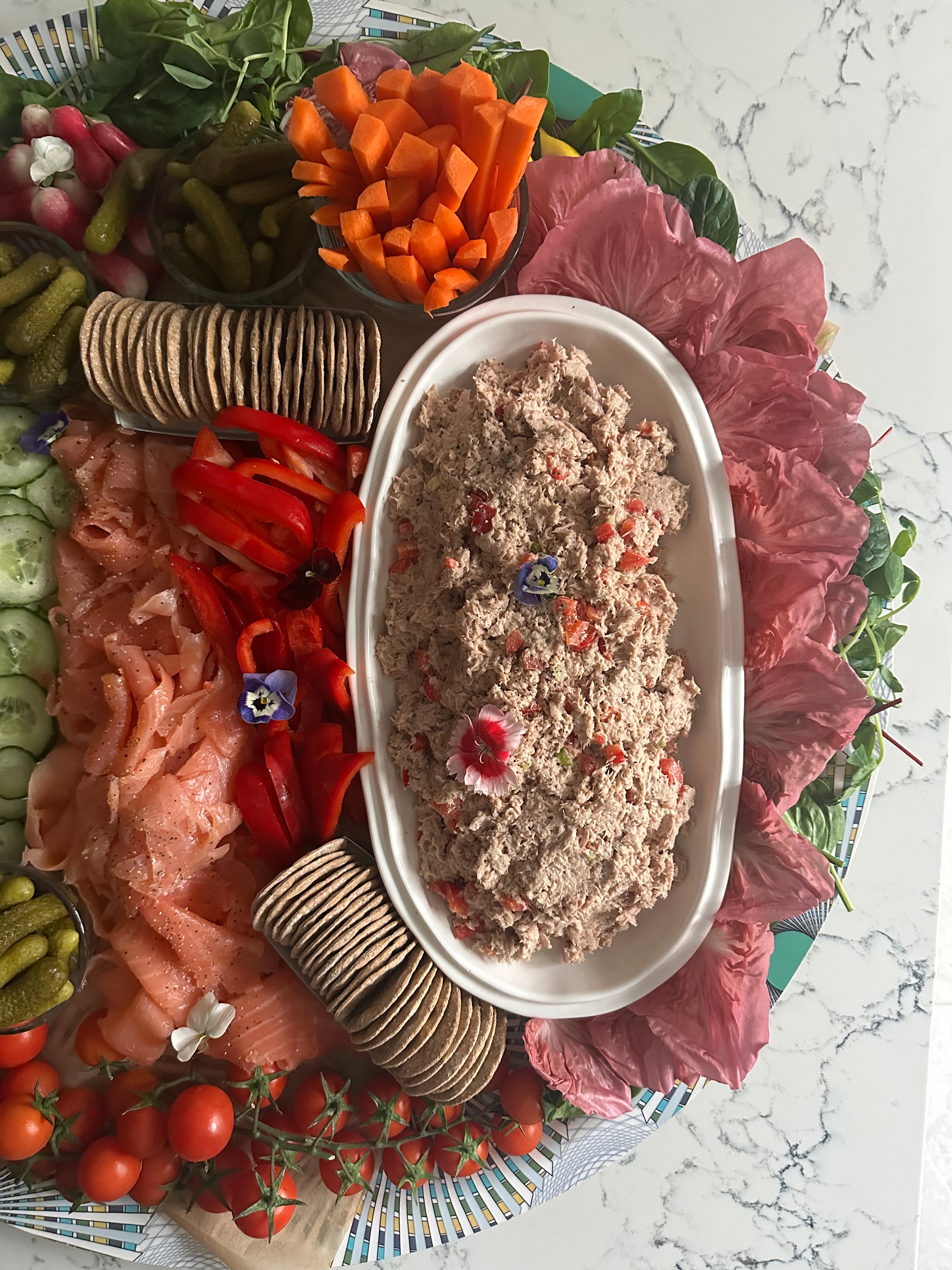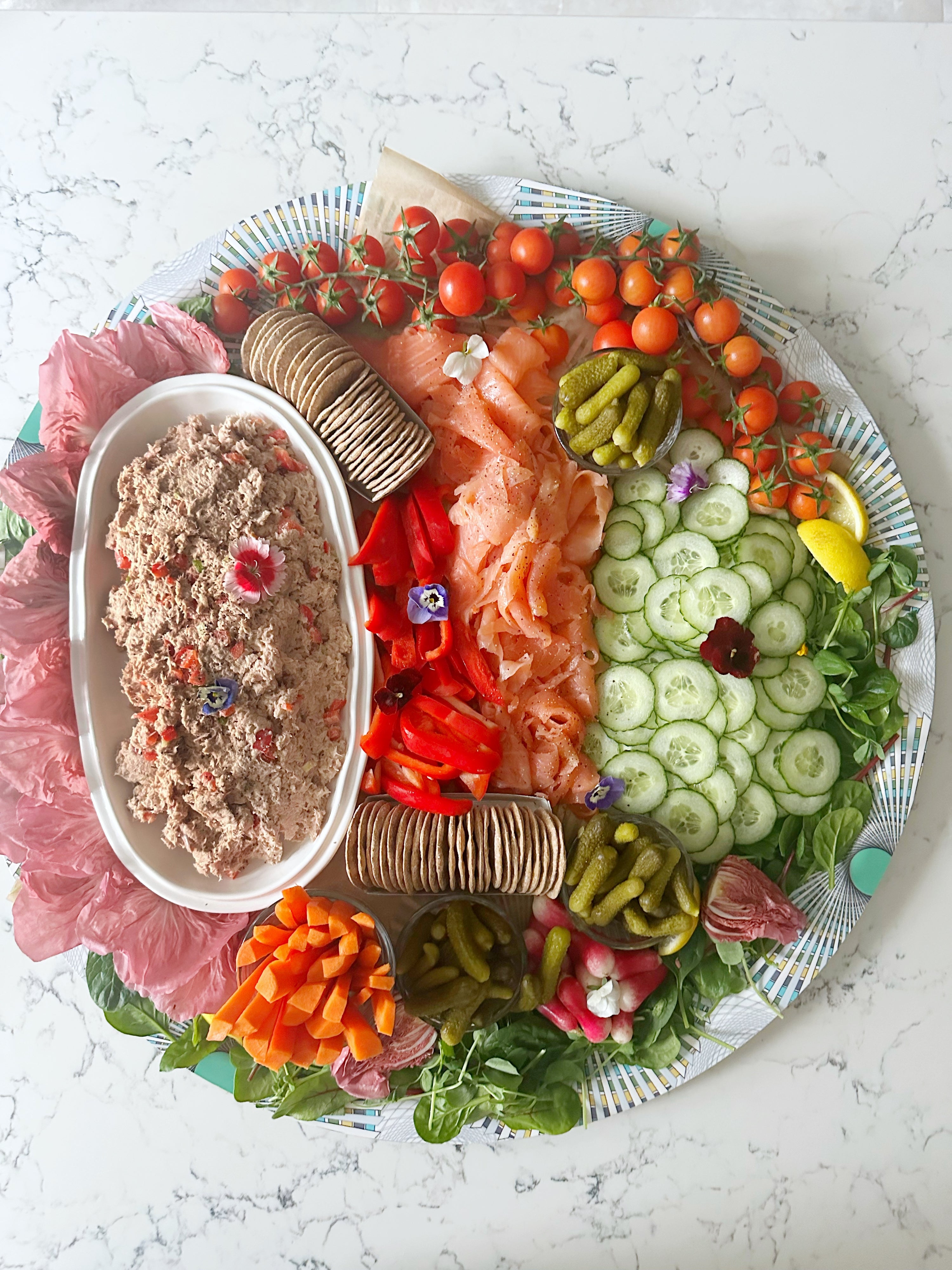 Includes, mini bagels, assorted crackers. Smoked salmon, tuna salad, egg mayo, whipped cream cheese, seasonal crudités, mini sweetcorn & feta frittatas. The perfect sharing platter!