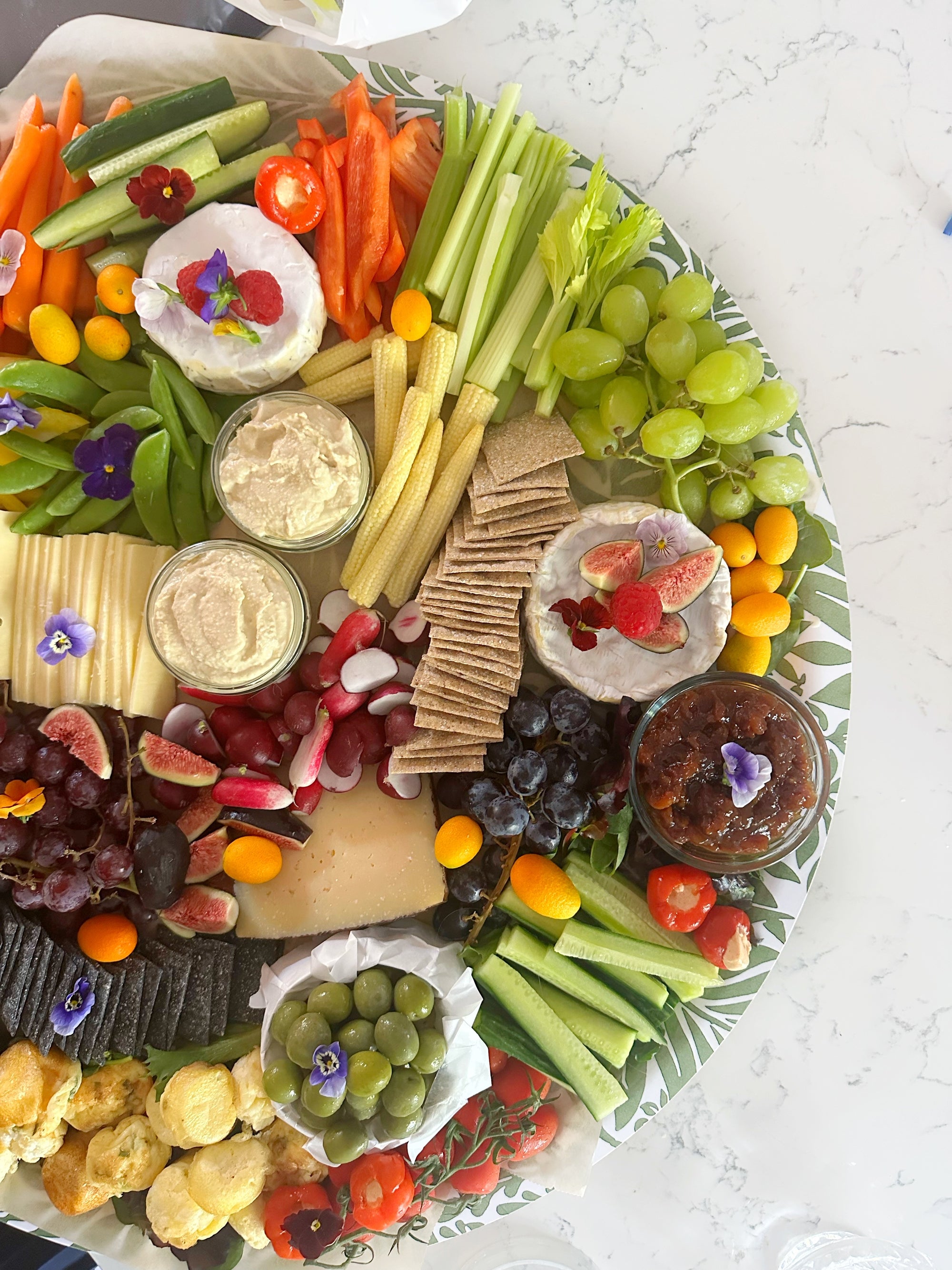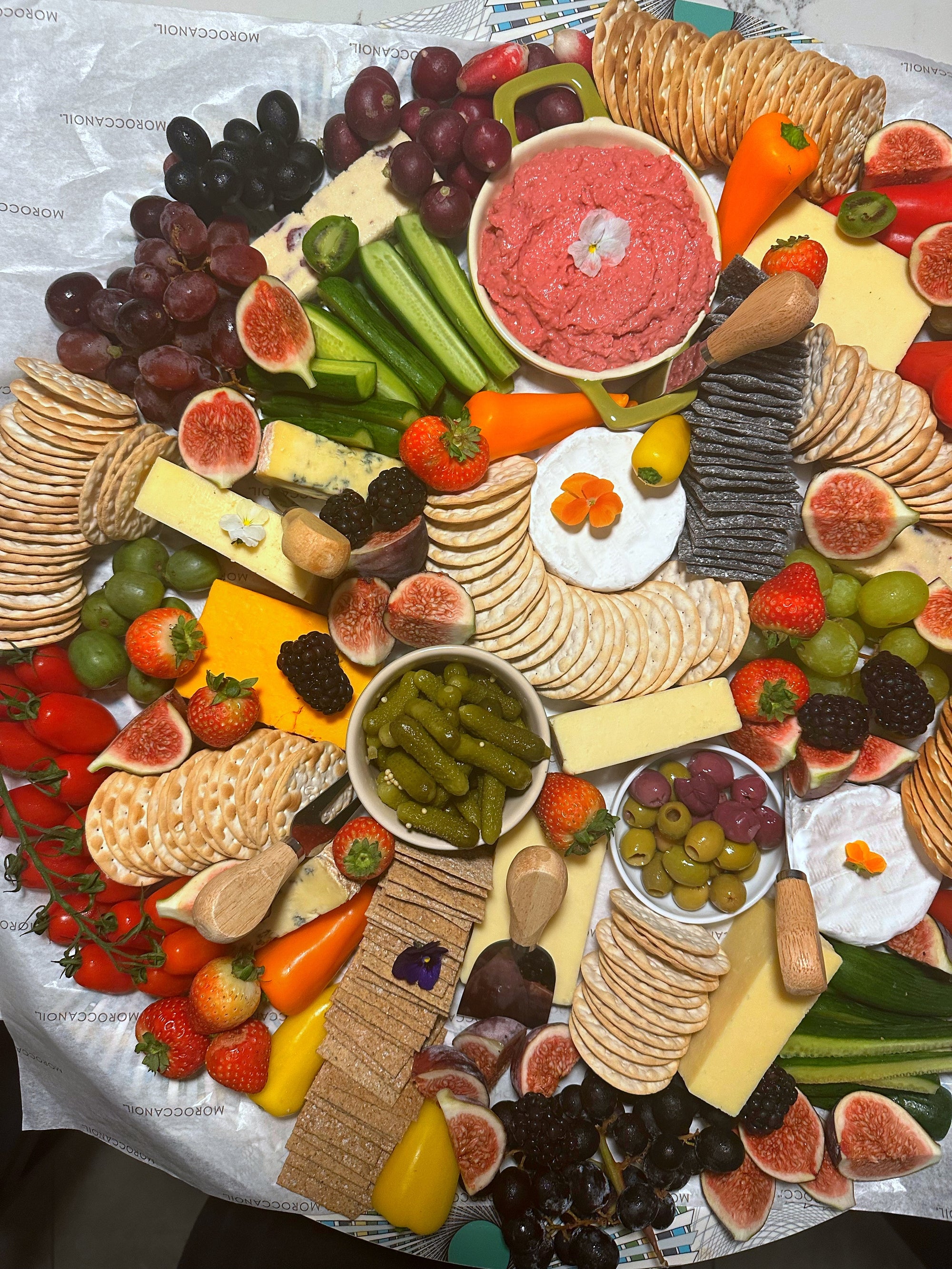 Finest cheese selection, Crudités, Beet hummus & hummus , assorted crackers, mini roasted veg frittatas, roasted nuts, olives, pickles, grapes & dates make this the perfect sharing platter!