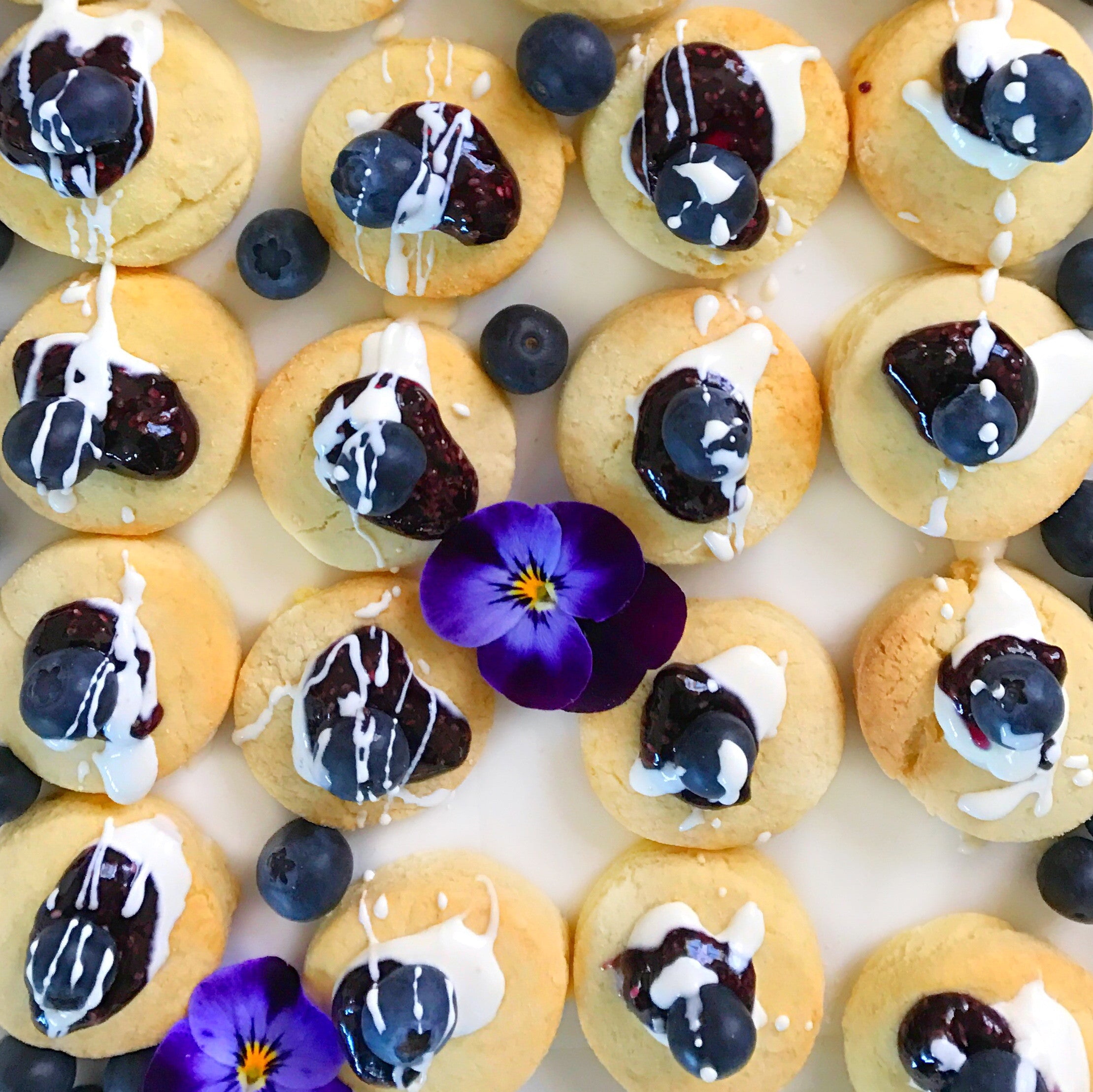 Mini Scones topped with fresh blueberry and chia seed jam and fresh cream. Garnished with fresh blueberries